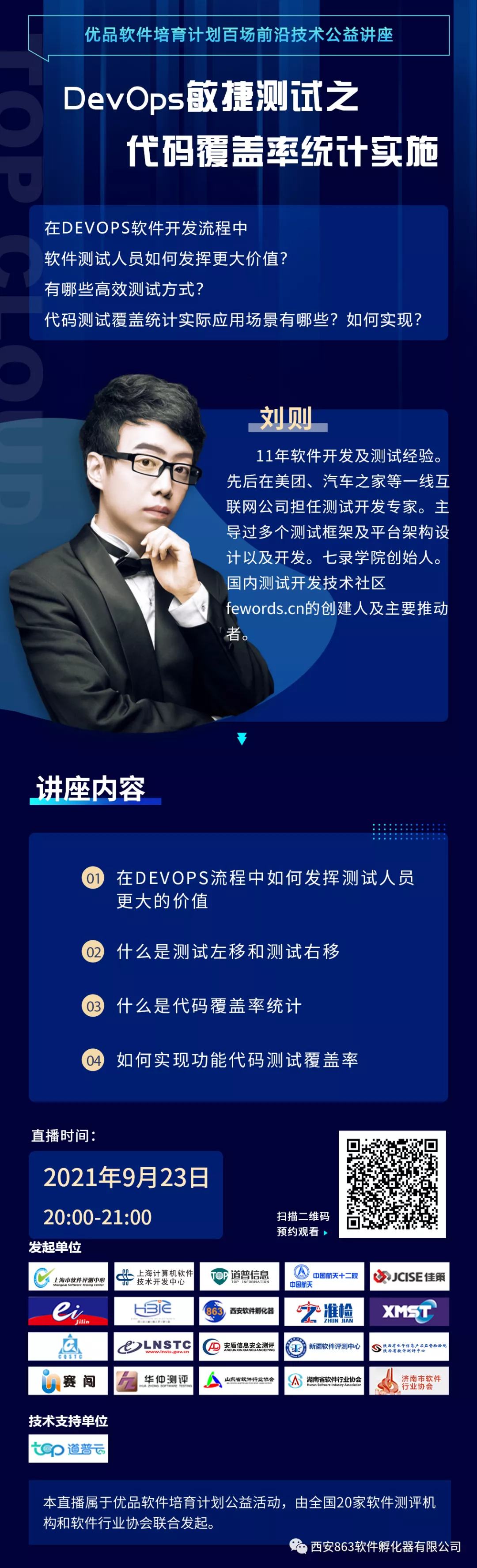 一、 直播時間: 2021年09月23日 20:00 二、 直播主題: DevOps敏捷測試之代碼覆蓋率統(tǒng)計實(shí)施 三、 講座提綱: 1. 在DevOps流程中如何發(fā)揮測試人員更大的價值 2. 什么是測試左移和測試右移 3. 什么是代碼覆蓋率統(tǒng)計 4. 如何實(shí)現(xiàn)功能代碼測試覆蓋率 四、 主講人介紹: 劉則,七錄學(xué)院創(chuàng)始人&CEO,11年軟件開發(fā)及測試經(jīng)驗(yàn),先后在美團(tuán)、汽車之家等一線互聯(lián)網(wǎng)公司擔(dān)任測試開發(fā)專家,主導(dǎo)過多個測試框架、測試平臺架構(gòu)設(shè)計以及開發(fā)。曾為大唐電信、中國移動研究院等知名企業(yè)提供性能測試、自動化測試等服務(wù)。五年授課經(jīng)驗(yàn),騰訊課堂累計聽課人數(shù)超過1萬。中國政法大學(xué)《大數(shù)據(jù)智能分析》專職講師。國內(nèi)測試開發(fā)技術(shù)社區(qū)fewords.cn的創(chuàng)建人及主要推動者。 五、 直播流程 1. 優(yōu)品軟件培育計劃及本期合作機(jī)構(gòu)介紹 2. 主講人介紹 3. 主講人開始演講 4. 現(xiàn)場答疑互動 5. 下期直播預(yù)告 六、 觀看方式: 掃描宣傳頁中的二維碼→進(jìn)入社群→群內(nèi)點(diǎn)擊直播鏈接→觀看 (來源:西安863軟件孵化器有限公司 原作者:管理員)