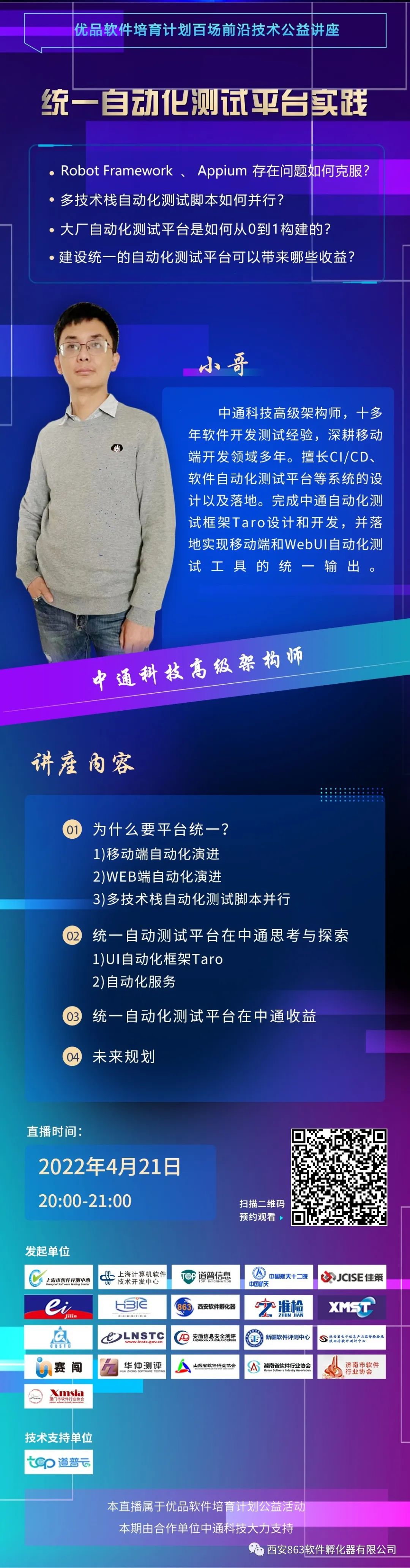 一、直播時間: 2022年4月21日 20:00 二、直播主題: 統(tǒng)一自動化測試平臺實踐 三、講座提綱: 1. 為什么要平臺統(tǒng)一? 1) 移動端自動化演進 2) Web端自動化演進 3) 多技術(shù)棧自動化測試腳本并行 2. 統(tǒng)一自動測試平臺在中通思考與探索 1) UI自動化框架Taro 2) 自動化服務(wù) 3. 統(tǒng)一自動化測試平臺在中通收益 4. 未來規(guī)劃 四、主講人介紹: 小哥,中通科技高級架構(gòu)師,十多年軟件開發(fā)測試經(jīng)驗,深耕移動端開發(fā)領(lǐng)域多年。擅長CI/CD、軟件自動化測試平臺等系統(tǒng)的設(shè)計以及落地。完成中通自動化測試框架Taro設(shè)計和開發(fā),并落地實現(xiàn)移動端和WebUI自動化測試工具的統(tǒng)一輸出。 五、直播流程 1. 優(yōu)品軟件培育計劃及本期合作機構(gòu)介紹 2. 主講人介紹 3. 主講人開始演講 4. 現(xiàn)場答疑互動 5. 下期直播預(yù)告 六、觀看方式: 掃描宣傳頁中的二維碼→進入社群→群內(nèi)點擊直播鏈接→觀看