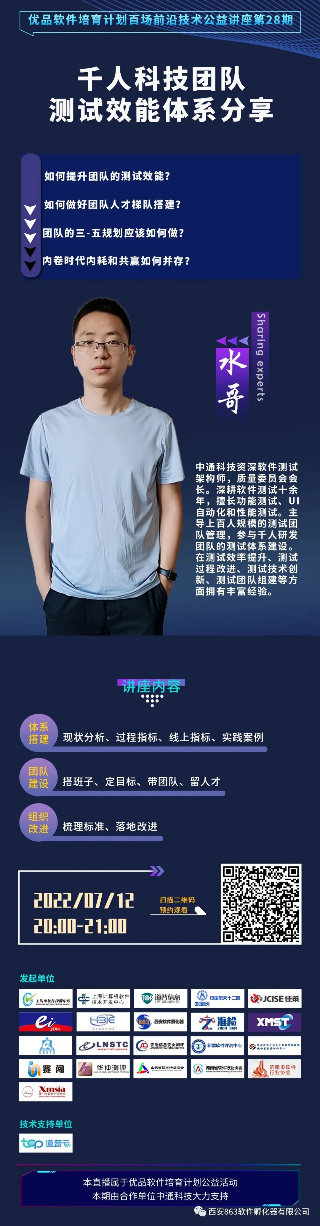 四、主講人介紹: 水哥,中通科技資深軟件測試架構師,質量委員會會長。深耕軟件測試十余年,擅長功能測試、UI自動化和性能測試。主導上百人規(guī)模的測試團隊管理,參與千人研發(fā)團隊的測試體系建設。在測試效率提升、測試過程改進、測試技術創(chuàng)新、測試團隊組建等方面擁有豐富經驗。