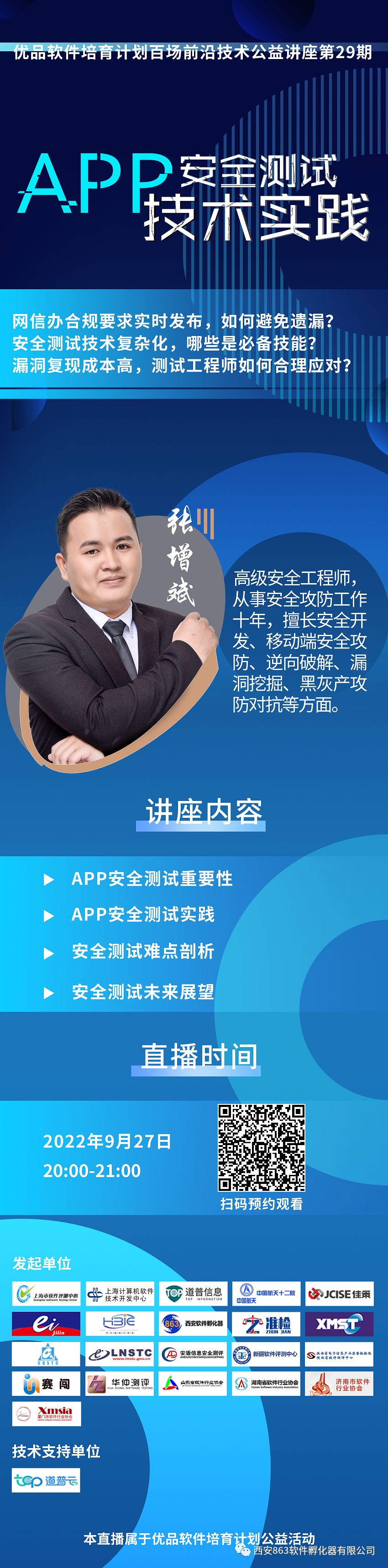 一、直播時(shí)間: 2022年9月27日 20:00-21:00 二、直播主題: APP安全測試技術(shù)實(shí)踐 三、講座提綱: 1、APP安全測試重要性 2、APP安全測試實(shí)踐 3、安全測試難點(diǎn)剖析 4、安全測試未來展望 四、主講人介紹: 張?jiān)霰?,高?jí)安全工程師,從事安全攻防工作十年,擅長安全開發(fā)、移動(dòng)端安全攻防、逆向破解、漏洞挖掘、黑灰產(chǎn)攻防對(duì)抗等方面。 五、直播流程 1、優(yōu)品軟件培育計(jì)劃介紹 2、主講人介紹 3、主講人開始演講 4、現(xiàn)場答疑互動(dòng) 5、下期直播預(yù)告 六、觀看方式: 掃描宣傳頁中的二維碼→進(jìn)入社群→群內(nèi)點(diǎn)擊直播鏈接→觀看 (來源:西安863軟件孵化器有限公司 )